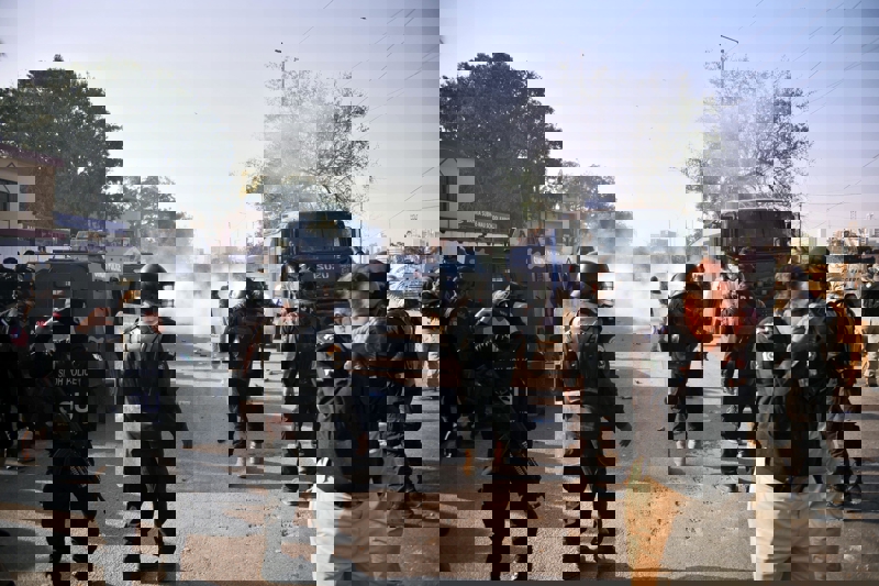 执法人员(画面右侧)在巴基斯坦南部城市卡拉奇的美国驻卡拉奇领事馆外控制局势。 新华社发(伊姆兰·阿里摄)