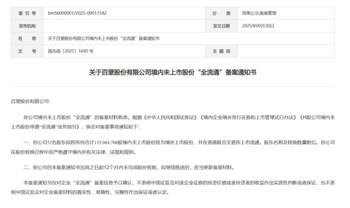 9月30日,中国证监会发布关于百望股份有限公司境内未上市股份“全流通”备案通知书。根据备案通知书,百望股份(06657)52名股东拟将所持合计135,064,706股境内未上市股份转为境外上市股份,并在香港联合交易所上市流通。公司自本备案通知书出具之日起12个月内未完成股份转换,拟继续推进的,应当更新备案材料。