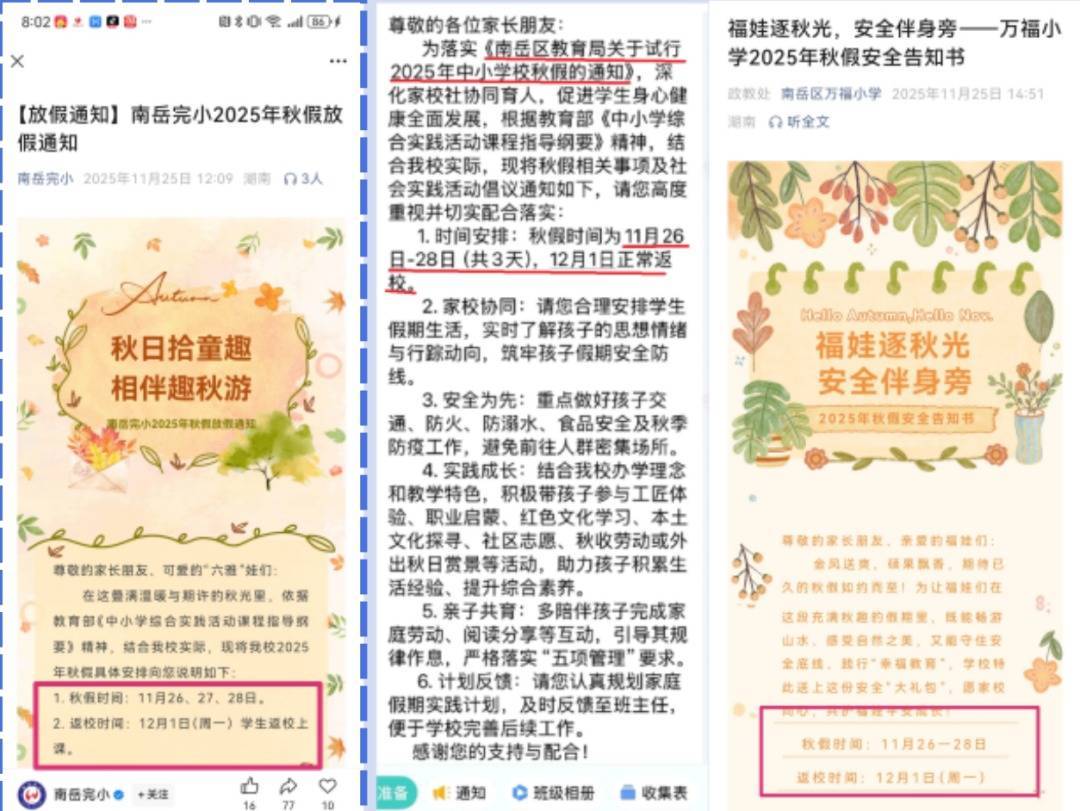 11月25日,记者得知衡阳市南岳区部分中小学已正式发布秋假通知盈策略,时间为11月26日至28日放假3天,12月1日正常返校。3天秋假与周末相连,形成5天连续假期。这也是湖南省首个公开的中小学秋假试点。来源:湖南日报